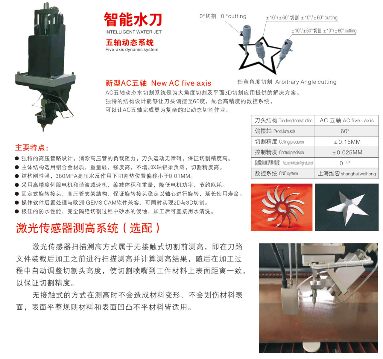 主要特點: 基于PC的控制系統,切割全過程自動化功能。 直接支持UG、MSATERCAM、CASMATE、ARTCAM、TUTOCAD、CORELDRAW等多種CAM/CAM軟件生成的G代碼,PLT代碼格式和精雕加工文件,ENG代碼格式,DXF文件格式。 在加工工件的拐點處自動減速以保證切割質量。 模擬加工同步跟蹤顯示功能。 支持斷點記憶,跳段執行等高級自動功能。 故障自動診斷和顯示功能。 特有參數自動回復功能,系統自動保存參數設置信息,省去多次繁雜的參數設置